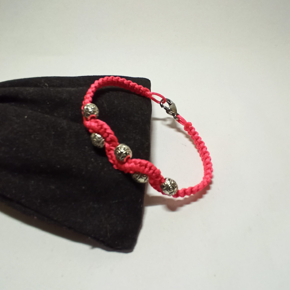 Braccialetto in paracord tinta unita in poliestere superlucido 16 fusi. Il motivo è composto da 5 beading in acciaio. La chiusura è in acciaio, la lavorazione del cordino è un intreccio paracord a motivo onda. Le chiusure in acciaio sono recuperate da fine stock di un magazzino di accessori, così come i beading. Il filato utilizzato è ricavato da fine rocche stoccate avanzate da produzioni. In caso di emergenza o necessità il braccialetto è facilmente smontabile e dà la possibilità di avere del cordino in cotone utilizzabile per legare o bloccare. Unisex, disponibile in varie misure.