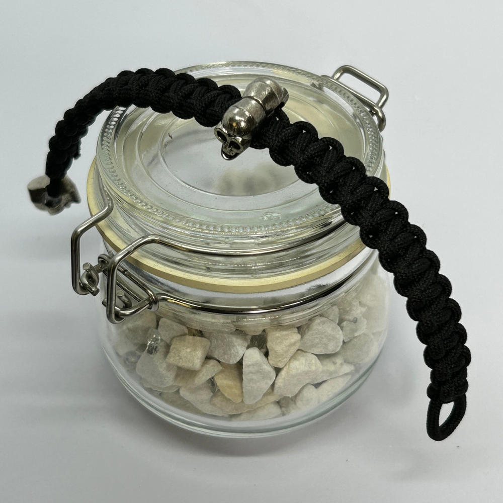 Braccialetto in paracord tinta unita con decorazione in acciaio. Il cordino paracord utilizzato è un 24 fusi in 100% poliestere. La chiusura è un teschio in acciaio, come le decorazioni centrali. I teschi in acciaio sono recuperati da fine stock di un magazzino di accessori. Il filato utilizzato è ricavato da fine rocche stoccate. In caso di emergenza o necessità il braccialetto è facilmente smontabile e dà la possibilità di avere del cordino tecnico utilizzabile per legare o bloccare. Unisex, disponibile in varie misure.