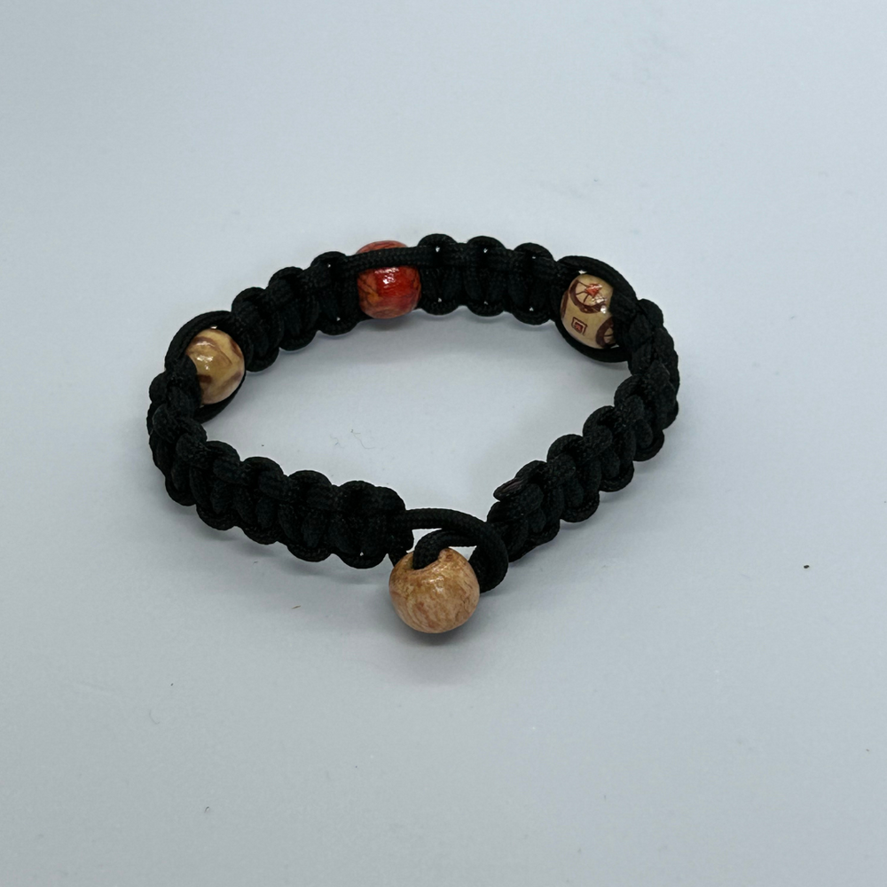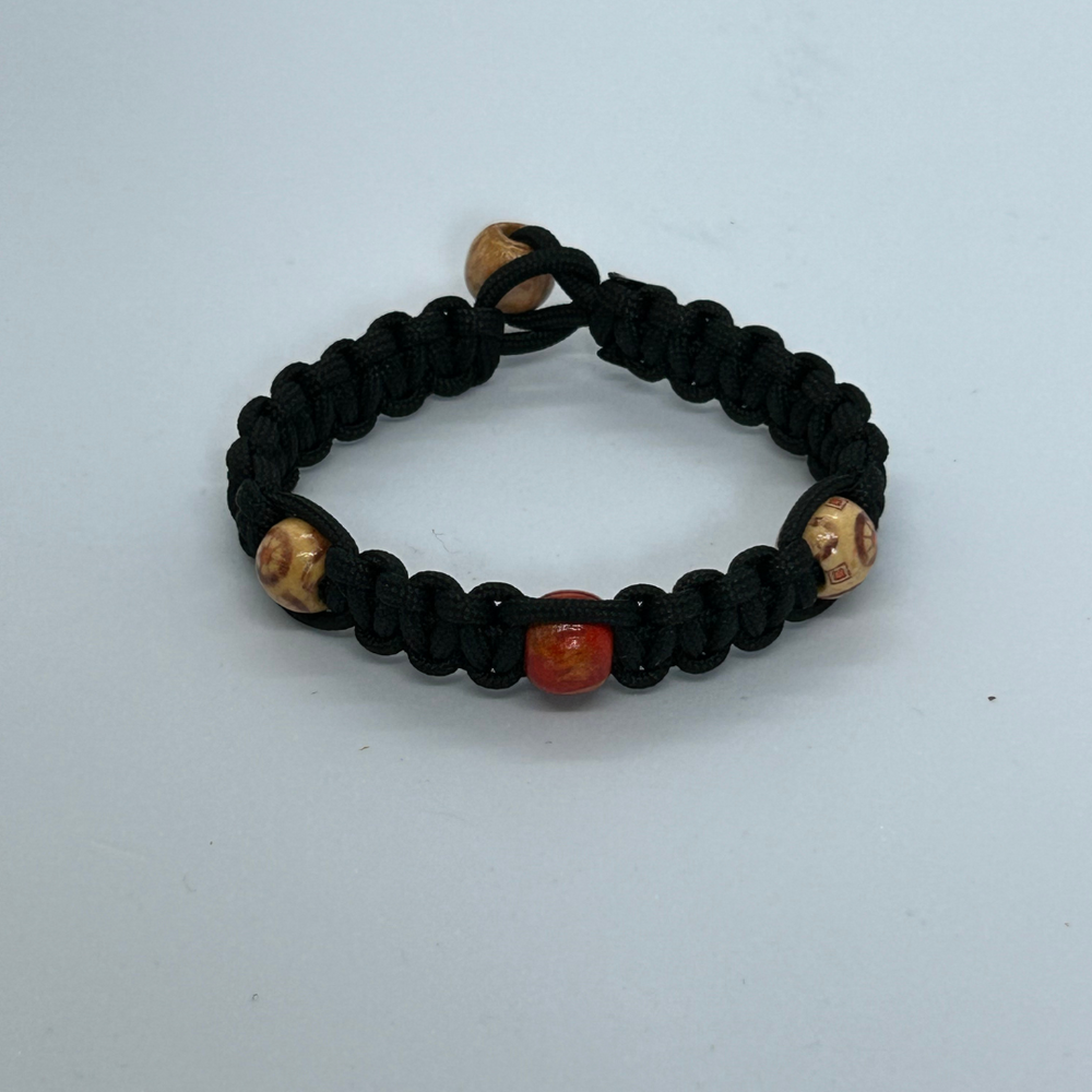 Braccialetto in paracord tinta unita con decorazione di accessori in legno. Il cordino paracord utilizzato è un 24 fusi in 100% poliestere. La chiusura è una pallina in legno, come le decorazioni centrali. Le perle in legno sono recuperate da fine stock di un magazzino di accessori. Il filato utilizzato è ricavato da fine rocche stoccate. In caso di emergenza o necessità il braccialetto è facilmente smontabile e dà la possibilità di avere del cordino tecnico utilizzabile per legare o bloccare. Unisex, disponibile in varie misure.